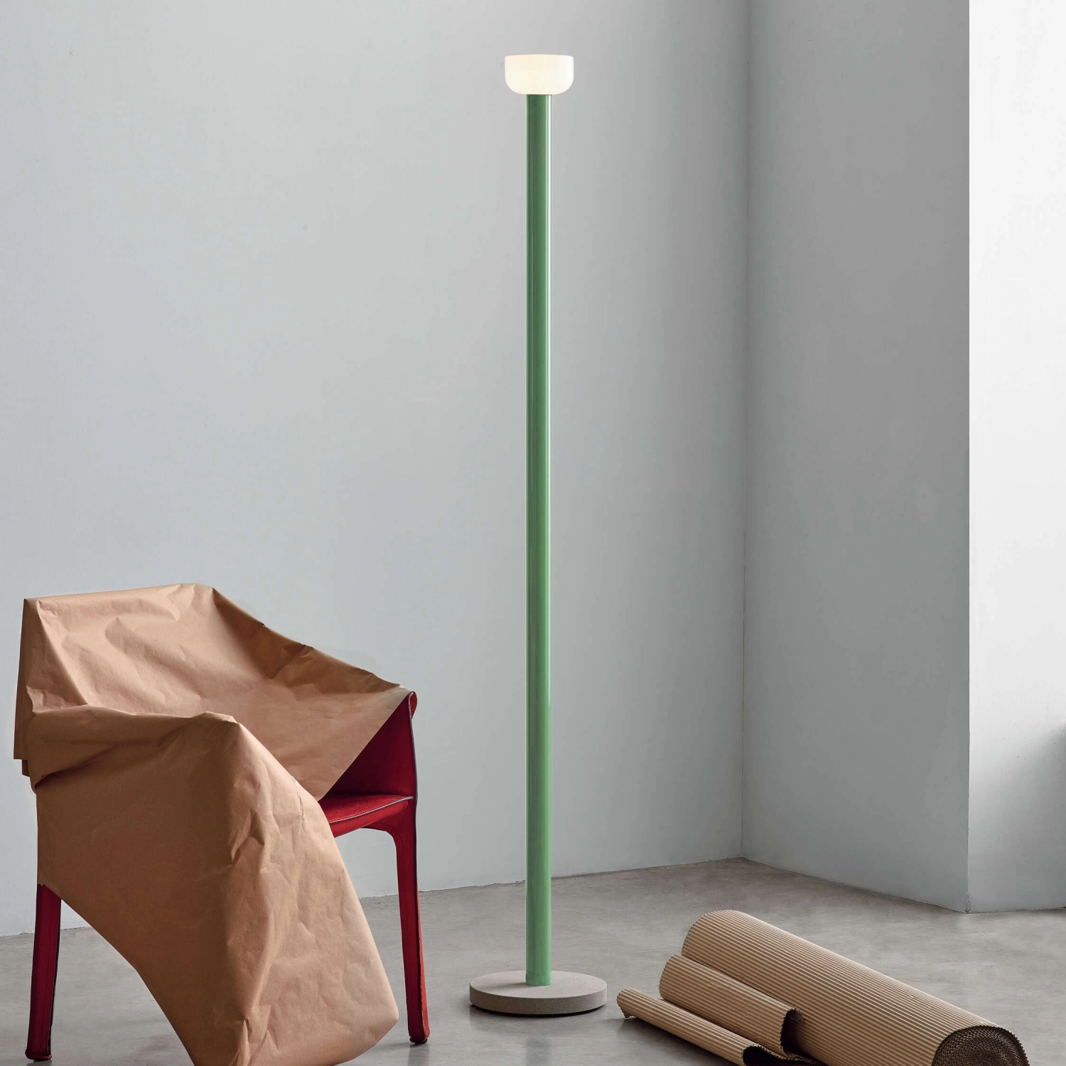 Floor lamp Bellhop Floor with indirect dimmable light, featuring a concrete base, a glossy painted aluminum stem, an opal blown glass reflector, and a foot dimmer. Ideal for illuminating large spaces.