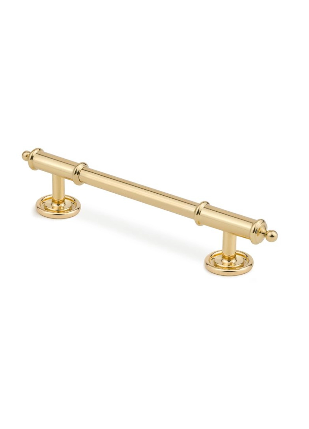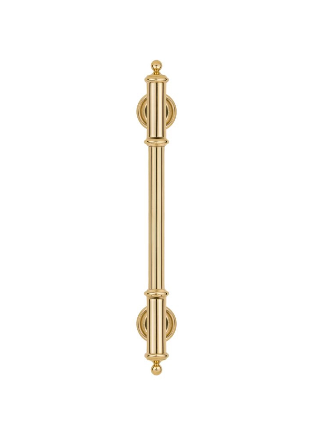 Lyon Long XL I furniture handle, made of brass, characterized by a rod design with ends finished with two tone-on-tone spheres and decorative rosettes at the base. Perfect for wardrobes, drawers, or kitchen furniture, its elegant style makes it suitable for any type of décor.