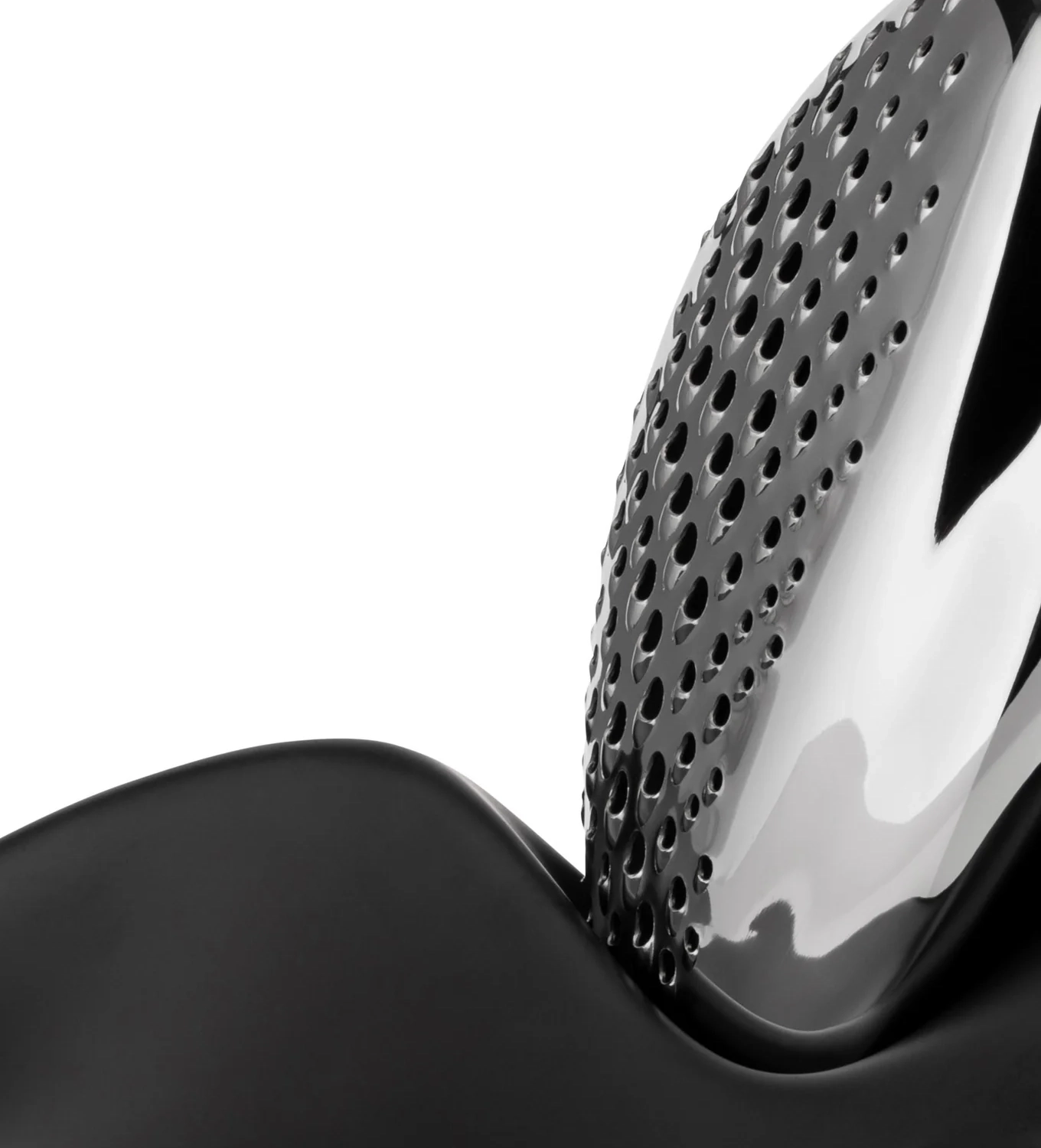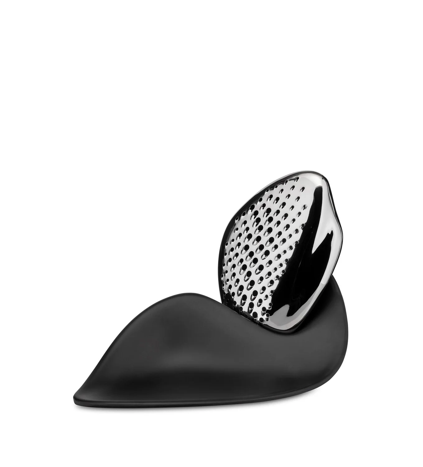 Grattugia in acciaio inossidabile 18/10 con base in melammina. Facile e piacevole da impugnare grazie alla forma ideata per adattarsi al palmo della mano, la grattugia e la sua base creano un unico pezzo scultoreo ideale per servire e grattuggiare, direttamente in tavola, il formaggio.